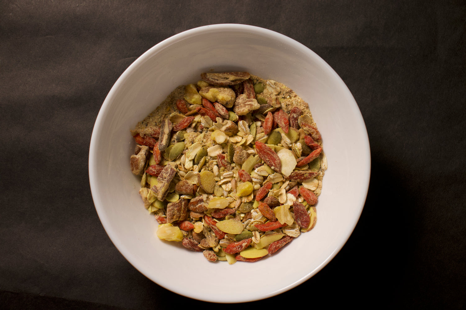 Ingredients: Spelt, Hemp Heart, Pumpkin Seeds, Walnuts, Old fashioned grits, Pearl Barley, Quinoa, Chia Seeds, Sliced almonds, Date sugar, Flax seed, Steel ground oats, Tumeric, Black pepper, Cinnamon, dried apples
